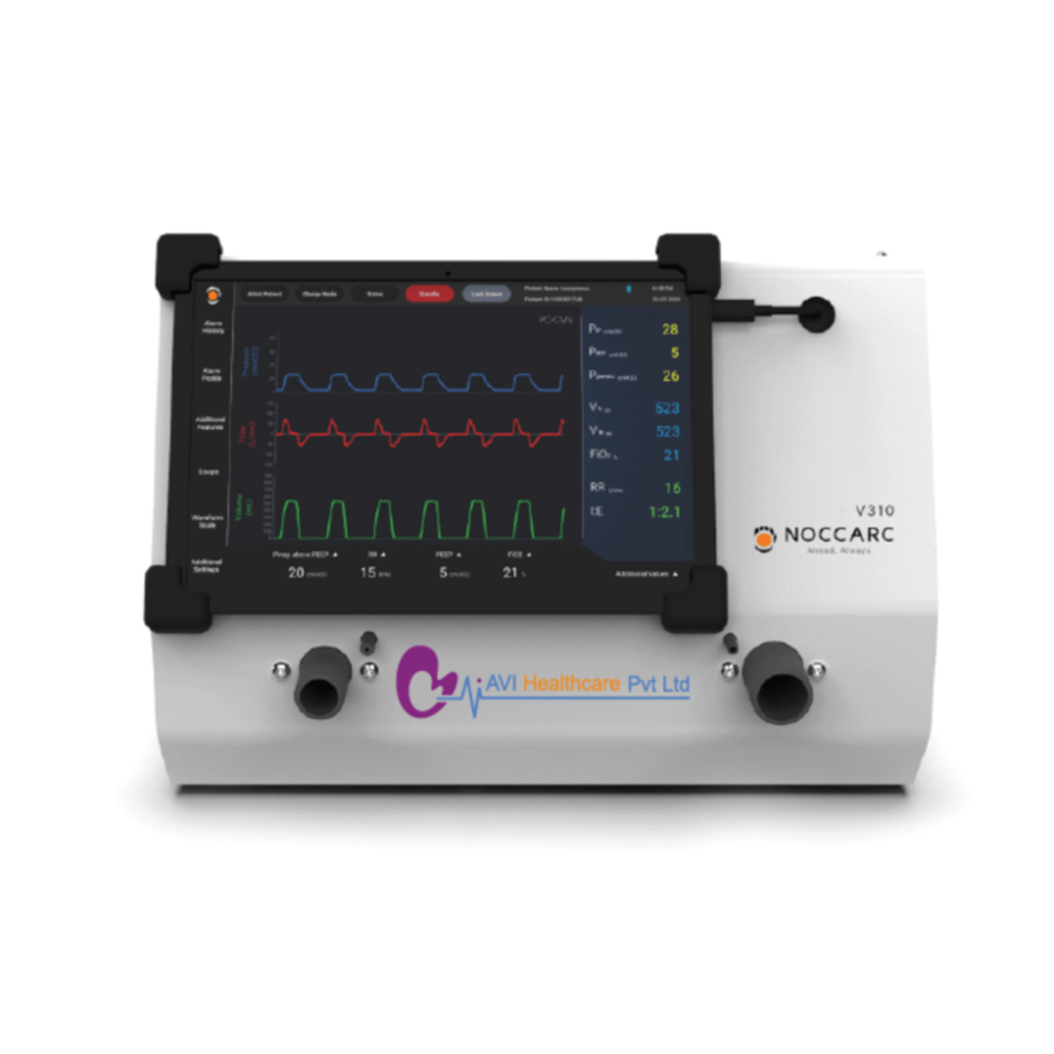 Noccarc V310 is a powerful turbine based ventilator with a battery backup of upto 8 hours. The compact, independent and power efficient design enables it to operate without compressed medical air or compressor, making it ideal for ICUs as well as intra hospital transport