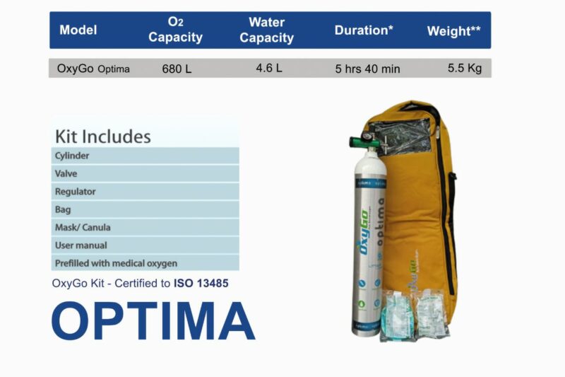 OxyGo Optima 680ltr Oxygen Cylinder is Light Weight Oxygen Cylinder, suitable for travel and carrying patinets.