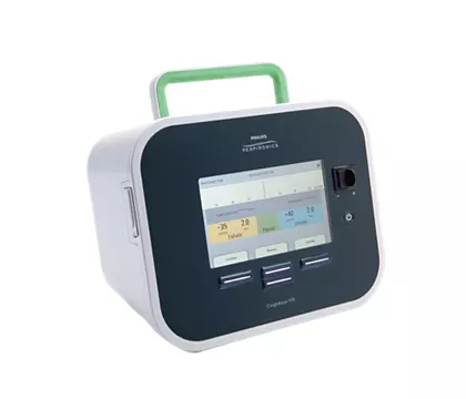 Philips Cough Assist E70 is a mechanical insufflation-exsufflation device designed to noninvasively clear secretions from the lungs by simulating a natural cough. Similar to a normal deep breath, CoughAssist gradually applies positive air pressure (insufflation) to obtain a large volume of air within the lungs. The device then quickly reverses the flow of air by shifting to negative air pressure (exsufflation). The resulting high expiratory flow helps mobilize secretions out of the airway as a deep, natural cough would do.