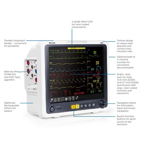 - Compact and cost-effective: Built according to Philips exacting quality standards, the G30E patient monitor offers market-proven essential parameters in a compact, cost-effective monitor to provide accurate measurement results within your tight budget. The alarm latch function helps reduce alarm fatigue to form a silent care environment.