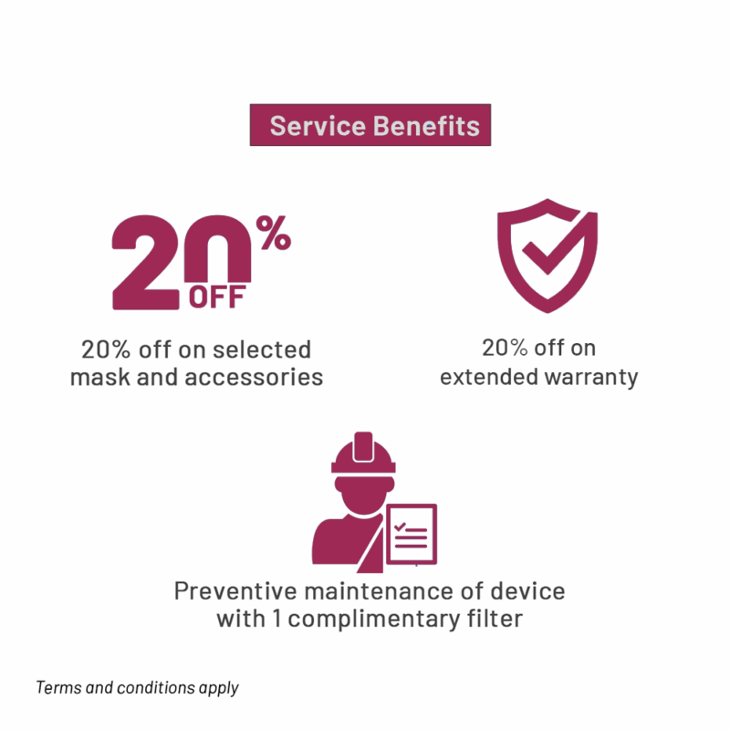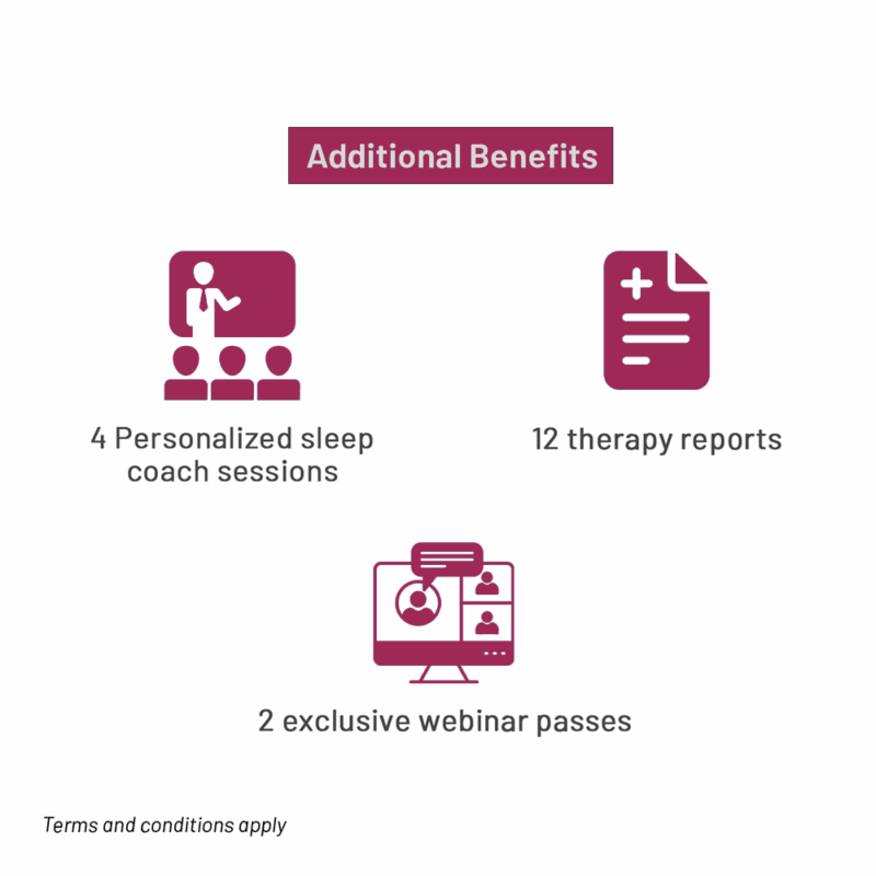 - Exclusive Benefits – 4 sleep coach* sessions, 12 therapy reports*, 20% off on select mask and accessories