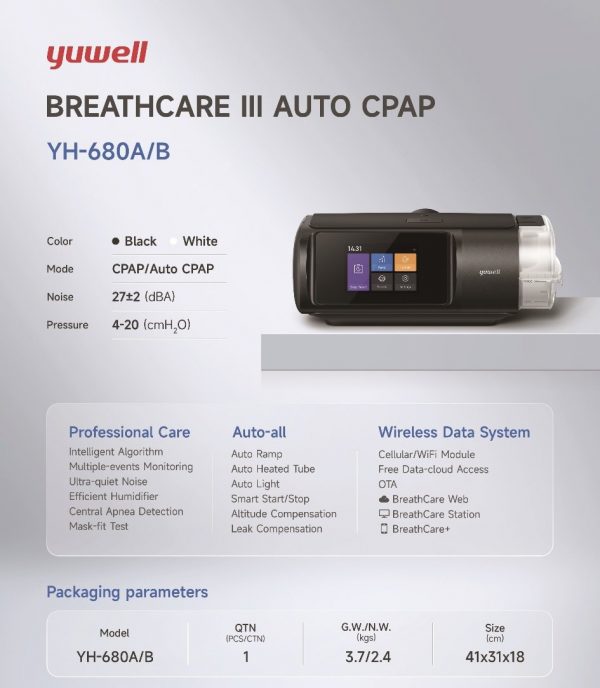 Yuwell YH-680A/B Breathcare III Auto CPAP is an advanced Auto CPAP machine designed for comfortable and effective sleep apnea therapy. With modern features like Wi-Fi connectivity, a responsive touchscreen interface, and automatic pressure adjustment, this device ensures a seamless user experience.